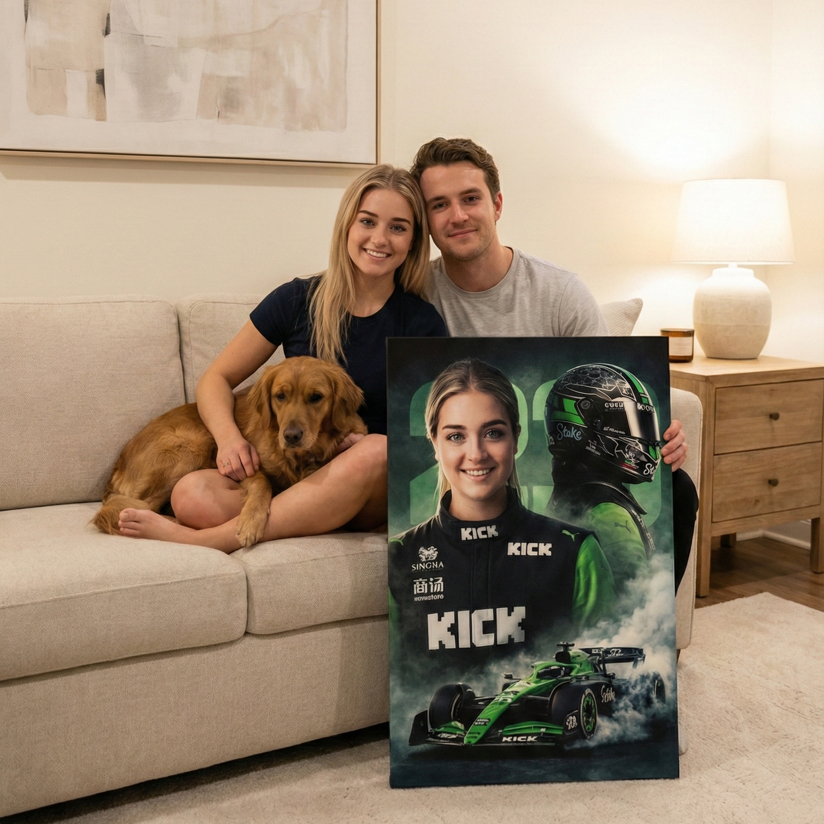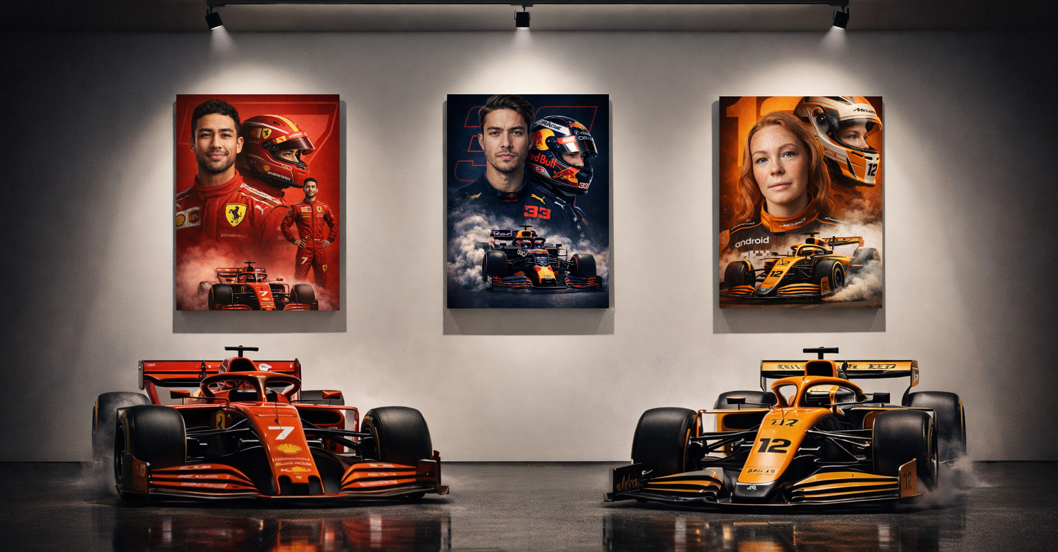 You choose a racing team, upload a photo, and we create your portrait. You’ll receive a digital preview for approval before anything is printed.